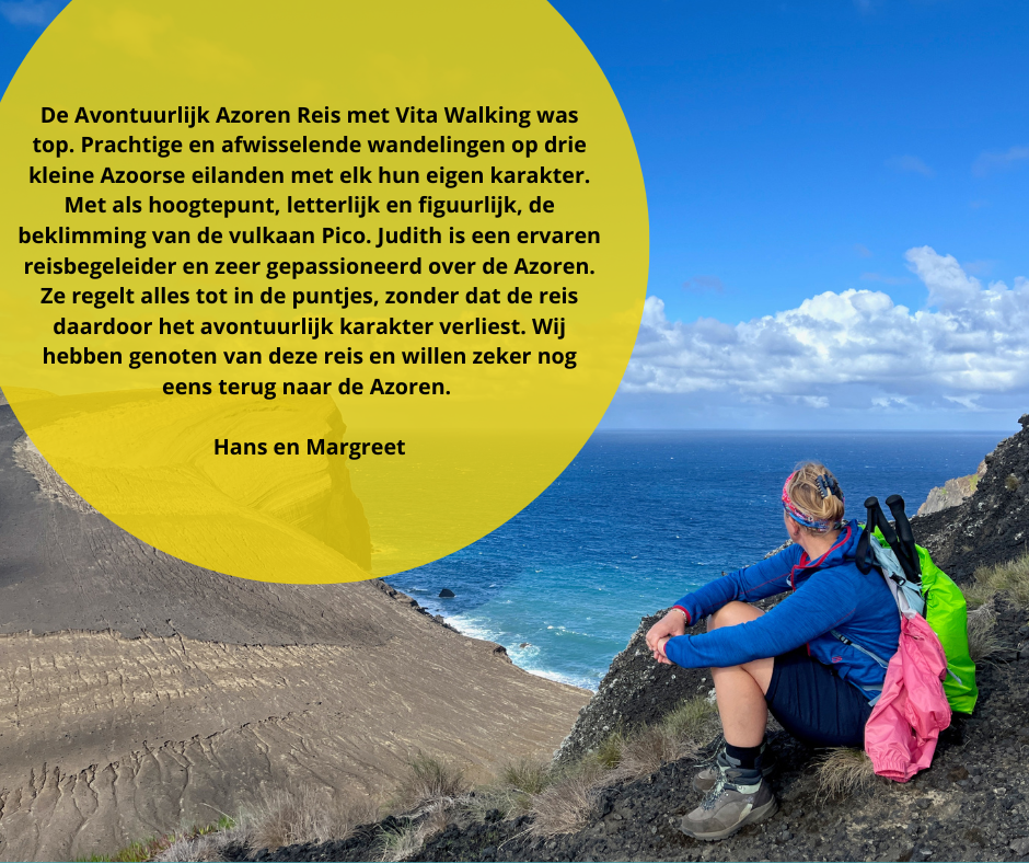 Deze wandelreis Avontuurlijk Azoren is voor de ervaren wandelaar. Stel, je bent mee geweest met de Vita Walking wandelreis Santa Maria en je wilt wel wat meer van die uitdagende stukjes uit die reis. Dan is dit echt wat voor jou! Of het lijkt je wel wat om eens de grenzen te ontdekken van je wandel-inspanningen. Maar dan wel onder goede begeleiding. Van die wandelingen waarvan je ’s avonds in bed direct in slaap valt omdat je alles hebt gegeven.